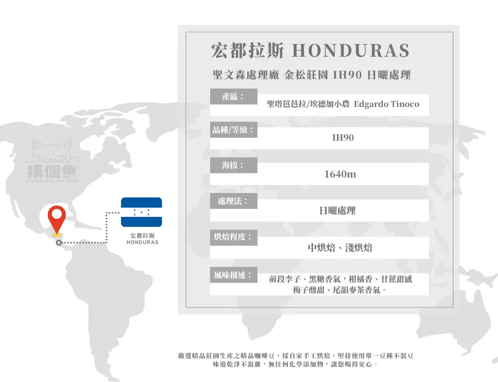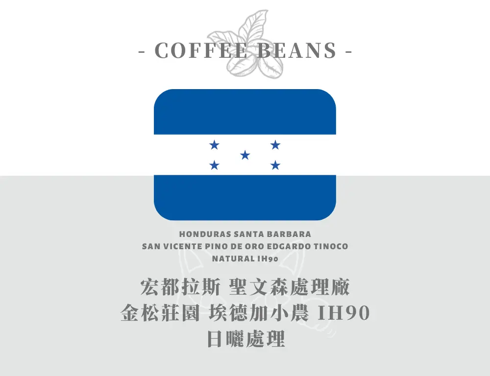 來自宏都拉斯 Santa Bárbara 產區金松莊園,由備受推崇的 聖文森處理廠 完成後製。本批次選用 IH90 品種,兼具穩定性與品質,金松莊園亦於 COE 競標屢獲佳績。
